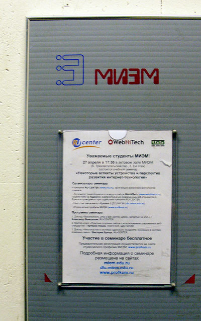 27 апреля в Московском государственном институте электроники и математики (МИЭМ) состоялся учебный семинар «Некоторые аспекты устройства и перспектив развития интернет-технологий». Это мероприятие организовали компания RU-CENTER, оргкомитет конкурса WebHiTech и Центр дистанционного обучения (ЦДО) МИЭМ при содействии студенческого профкома института.