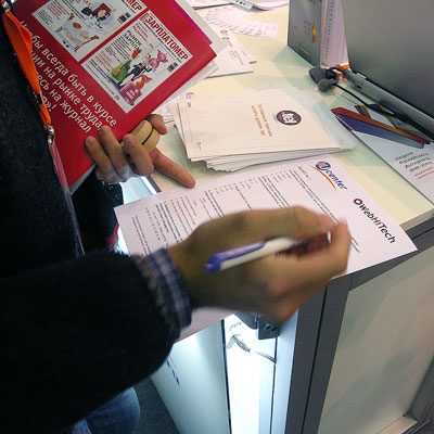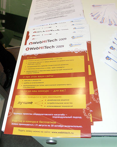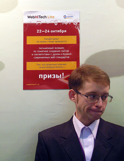 По сложившейся традиции, в рамках программы работы компании RU-CENTER в выставке состоялась акция в поддержку конкурса WebHiTech. Со стойки компании RU-CENTER любой желающий мог взять информационную листовку, рассказывающую о сущности конкурса. Ну а ключевым мероприятием акции стал мини-экзамен WebHiTech Lite по тематике веб-разработки в соответствии с духом и буквой современных веб-стандартов, аналогичный проведенному минувшей весной в рамках выставки «Связь-Экспокомм-2009».